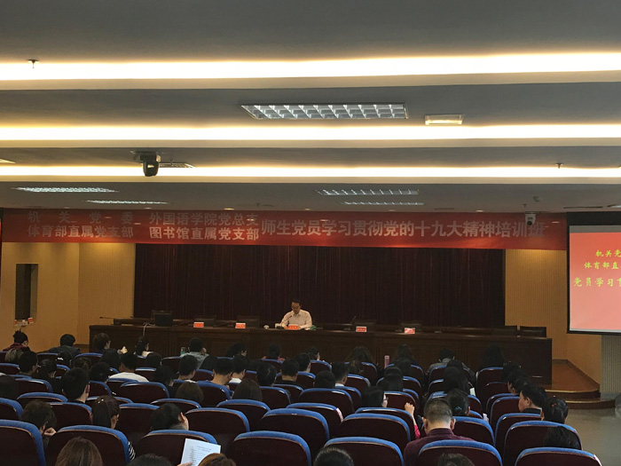 机关党委、外语学院党总支、yl88858永利集团直属党支部和图书馆直属党支部联合举办学习贯彻党的十九大精神培训班,200多名师生党员参加了学习,校党委常委、组织部长、机关党委书记陆振生主持了培训会。yl88858永利集团直属党支部全体党员共17人参加了培训班。