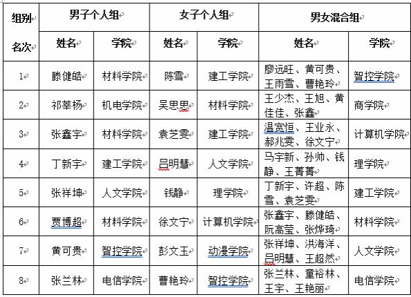 为全面贯彻落实中共中央办公厅、国务院办公厅印发《关于全面加强和改进新时代学校体育工作的意见》的文件精神,我校于2024年3月31日,在江宁校区体育馆成功举办了85588永利集团第二十一届运动会软式飞镖比赛,全校18个学院共计129名学生参加了比赛,经过积分赛、淘汰和附加赛两个阶段的激烈争夺,最终决出了男子个人前8名,女子个人前8名,男女混合前8名(具体名单附后)。