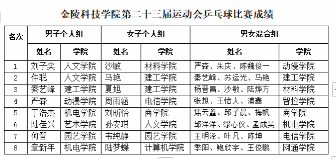 本次比赛,全校共有17个学院105名学生报名参加了比赛,经过积分赛、淘汰和附加赛两个阶段的激烈争夺,最终决出了男子个人前8名,女子个人前8名,男女混合团体前8名(具体名单附后)。