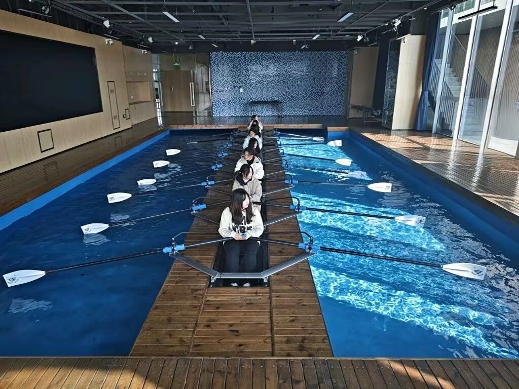 在活动中,吴畏以《如何解析“船道”赛艇测功仪训练数据含义与技术表现逻辑》为题,引导学生们开展互动研讨,带领学生对研究中心、省赛艇队训练基地进行实地考察,并向学生提出一个交叉学科创新研究选题:《基于Keiser3030三角训练机和Wattbike功率自行车训练数字化的关键技术研究与实现》。在软件工程学院研究生高顺祥的带领下,学生们分组参与了研究中心和荡桨池的动捕设备系统的安装、调试和数采工作,直观感受到数字体育的发展趋势和场景应用价值。
